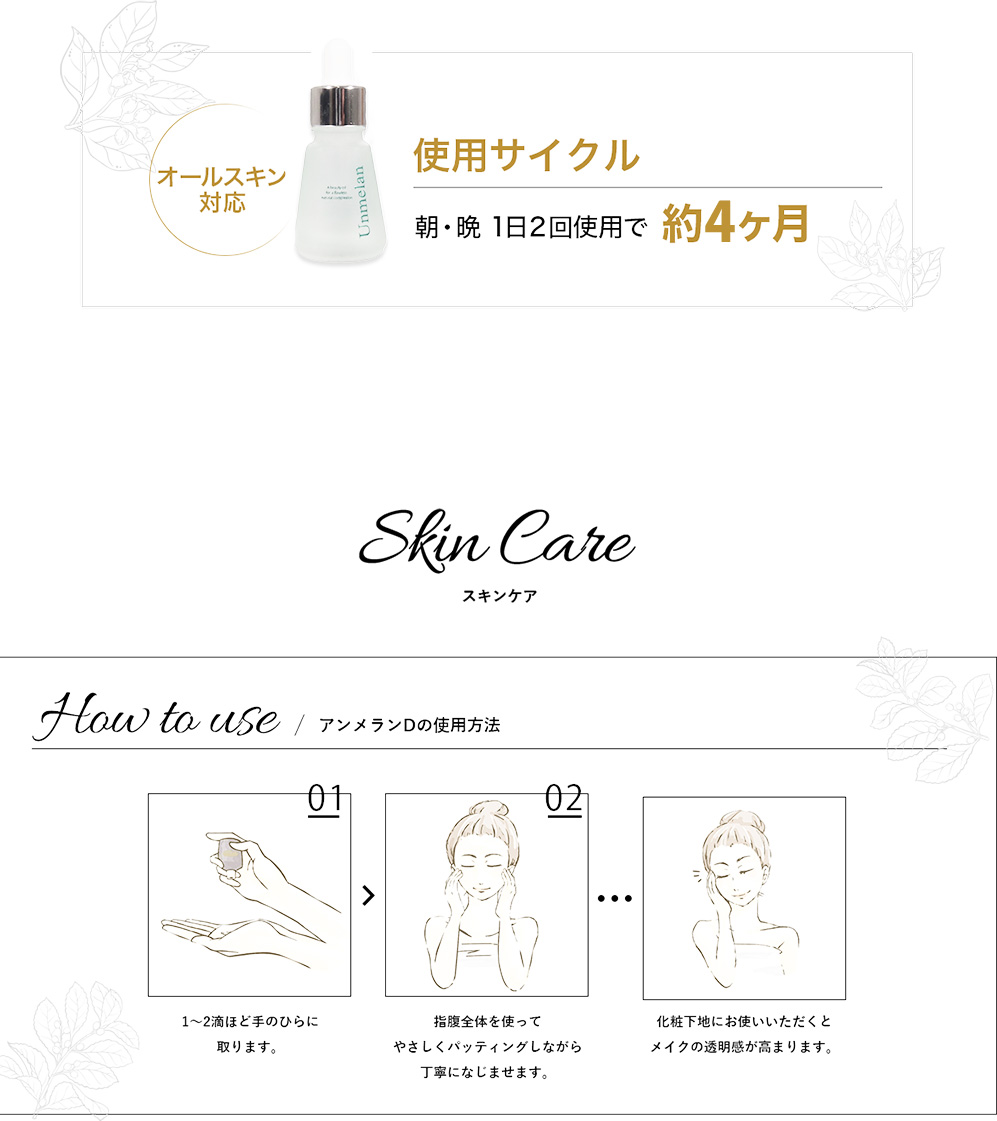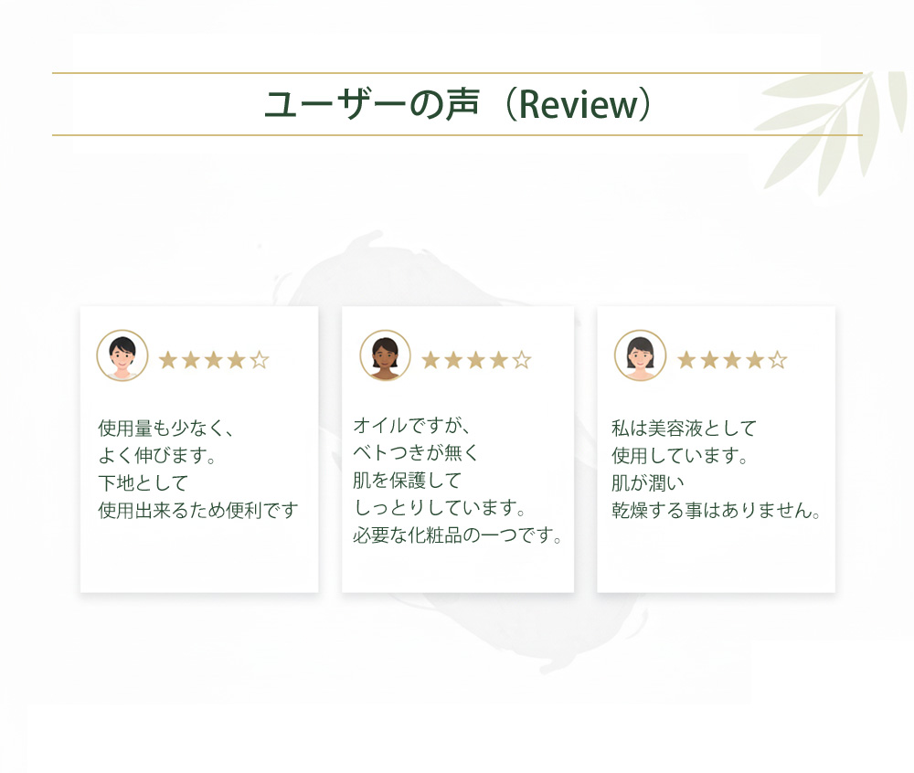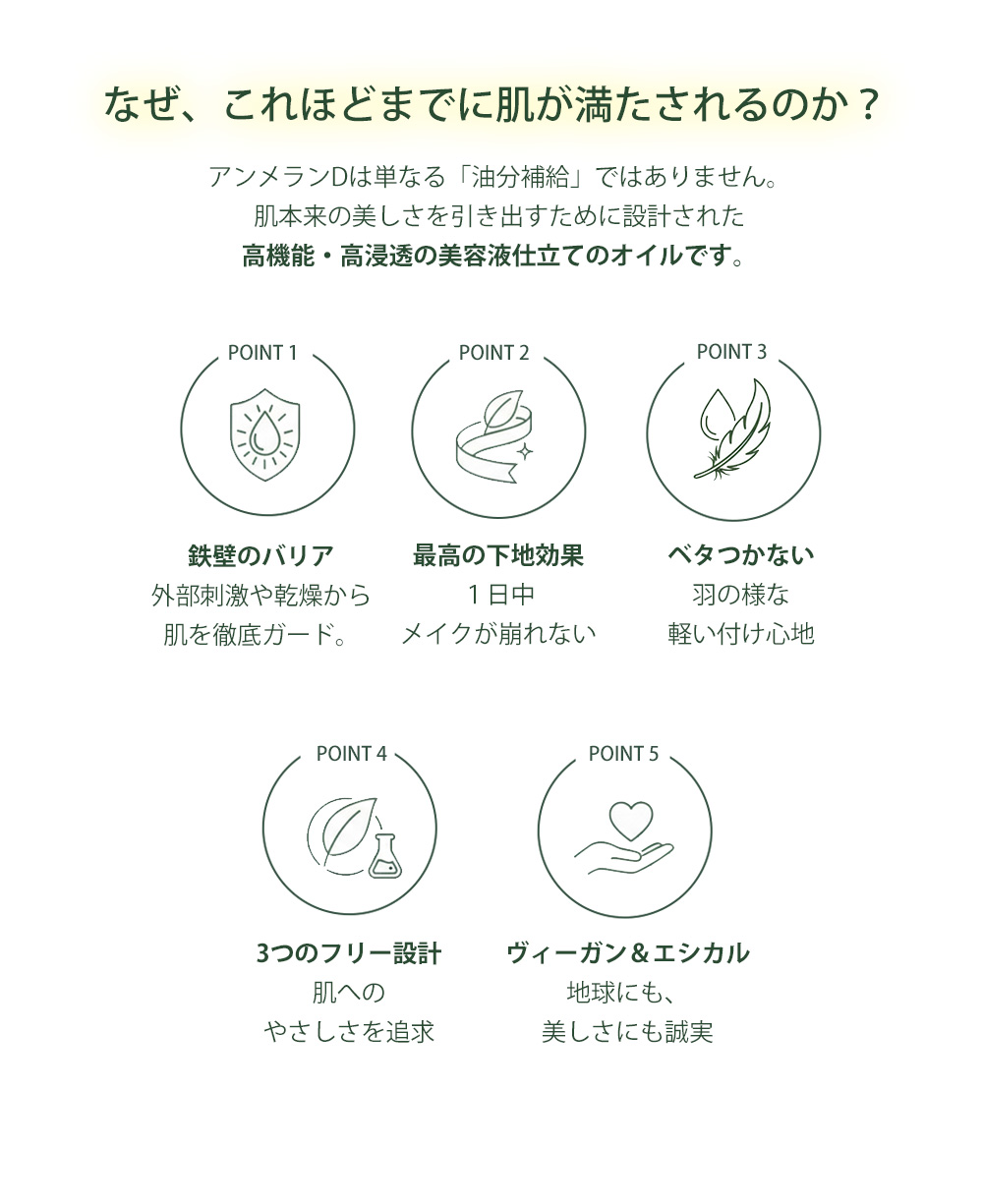 透明に輝くサラリとした植物系美容オイルです。 薄く軽くのびて、うるおいを守り、外気の刺激から肌を保護します。 肌本来の美しさを引き上げて、透明に輝く素肌美へと導きます。 メイクの下地にもどうぞ。