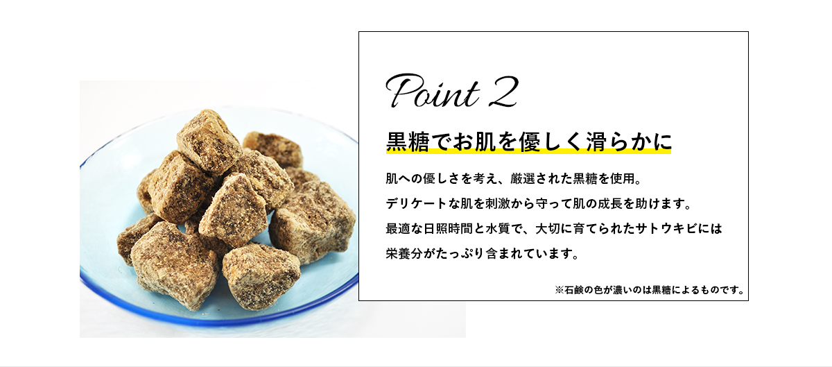 優しい肌触りの泡で石けん成分を残さず清潔に洗い上げます。 肌を刺激する旧表示指定成分は不使用。 保湿成分として沖縄産黒糖(コクトオリゴ含有)を配合しています。 うるおいを残して健やかな素肌に。