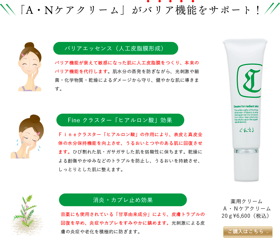 うるおいの膜を作りバリア機能を助けます。 外の刺激から肌を守り、肌内部の水分の蒸発を防ぎます。 乾燥や肌荒れを防いで、肌のイライラやカサカサなどを感じにくい、健やかで丈夫な肌へと導きます。合成界面活性剤は使用していません。